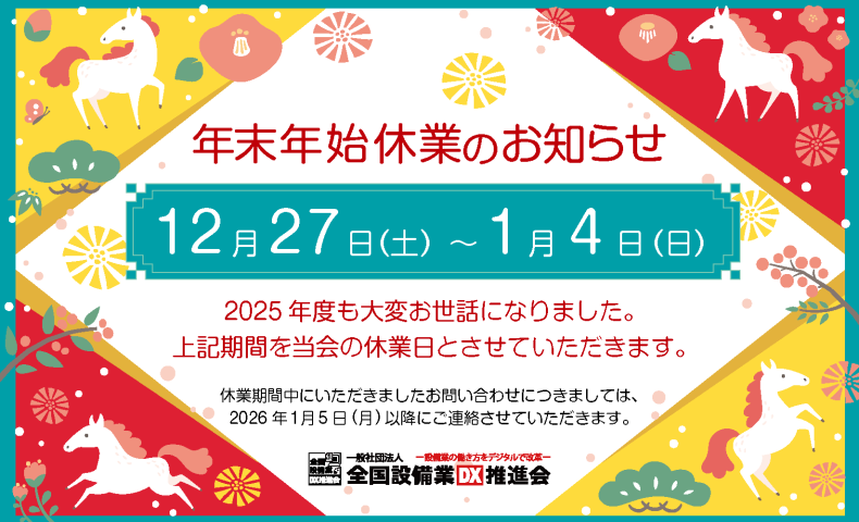 誠に勝手ながら、全国設備業DX推進会は下記の日程で年末年始の休業とさせていただきます。