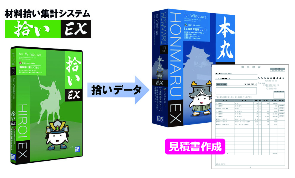 連動システムの「材料拾い集計システム 拾いEX」から出力された拾いデータを取り込んで見積書の作成時間を短縮できます。